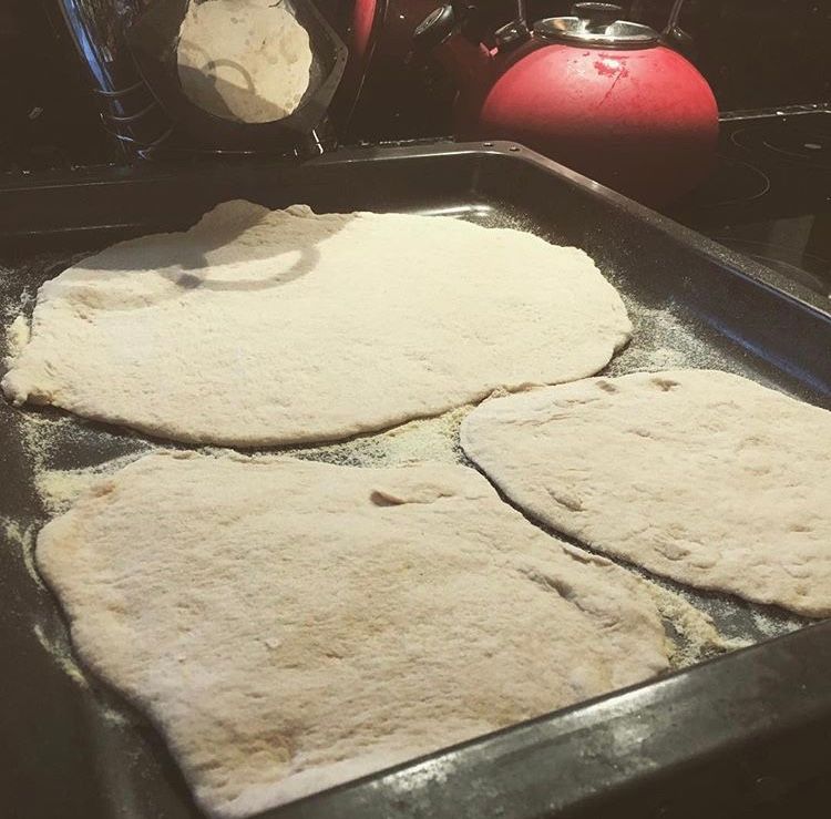 Dough about to go in very hot oven (240’C) until starting to crisp. We’ll then top with tomato purée (herbs for me, girls are going through a phase of not wanting too many herbs so not making into a big deal) then our chopped up veg & a little ham & pineapple then topped with some grated cheddar.