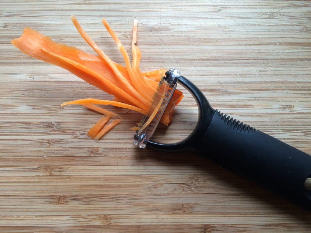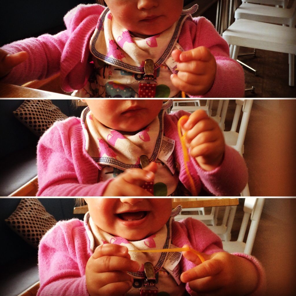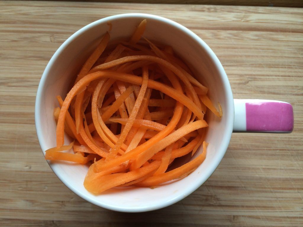 Cucumber sticks are still a difficult texture for my girls (9 months old) to cope with and so I wanted to try something different. We don’t have a spiraliser but we do have a julienne peeler (!) so I decided to experiment with that. It worked really well 😍 I also julienned 1/2 a carrot which I popped on a mug with a little water & covered before microwaving for 2 minutes to stream it. This texture seemed to work wells for they loved how the strips wiggled in their hands. We broke the longer ones up a little so that they were easier to manage.