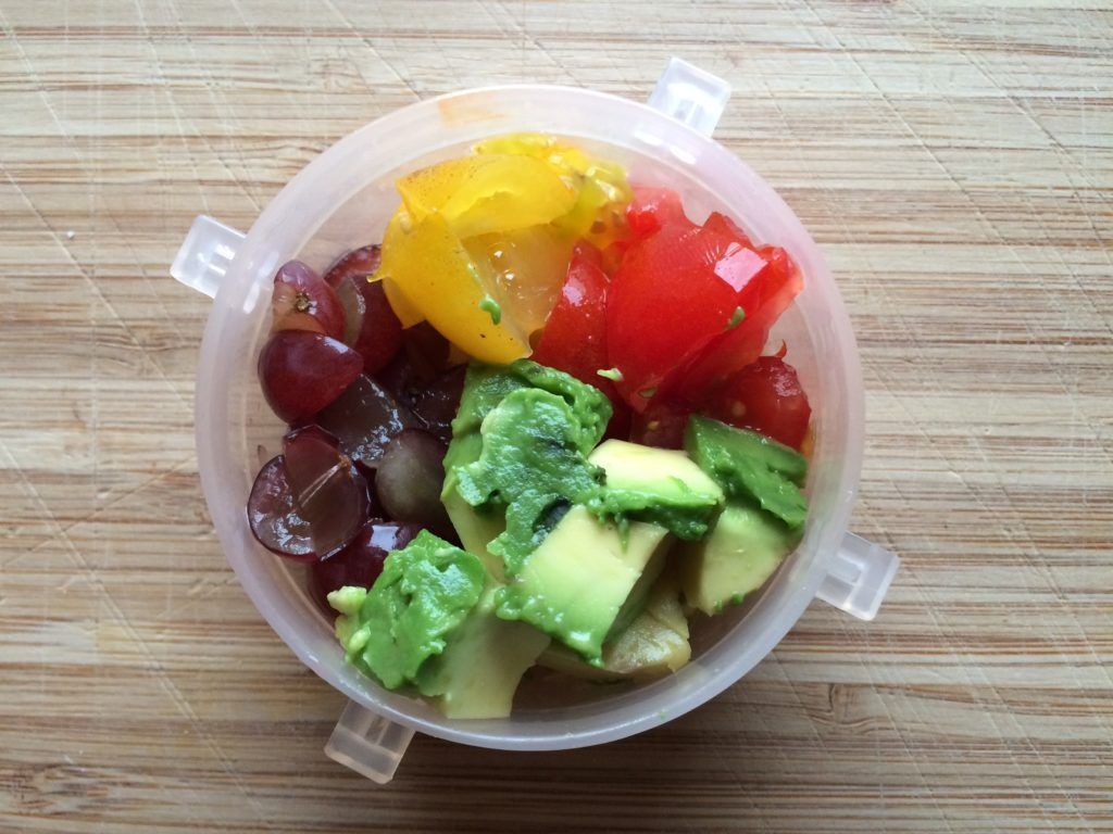 In another snack pot I quartered some small cherry tomatoes (from the greenhouse so yellow and red), chunked up a little avocado and quarter some grapes (always quarter to reduce choking risk).