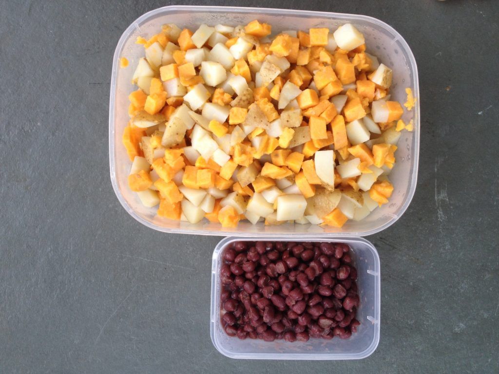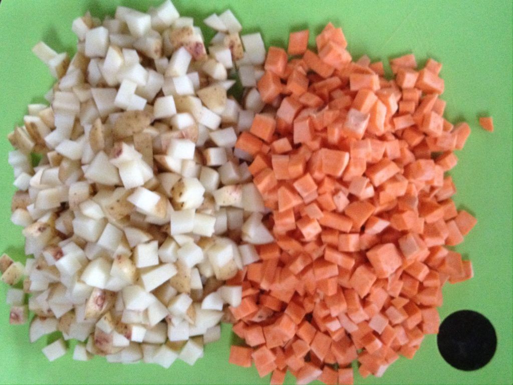 Boil the potato & sweet potato together. I used 3:2 potato to sweet potato.